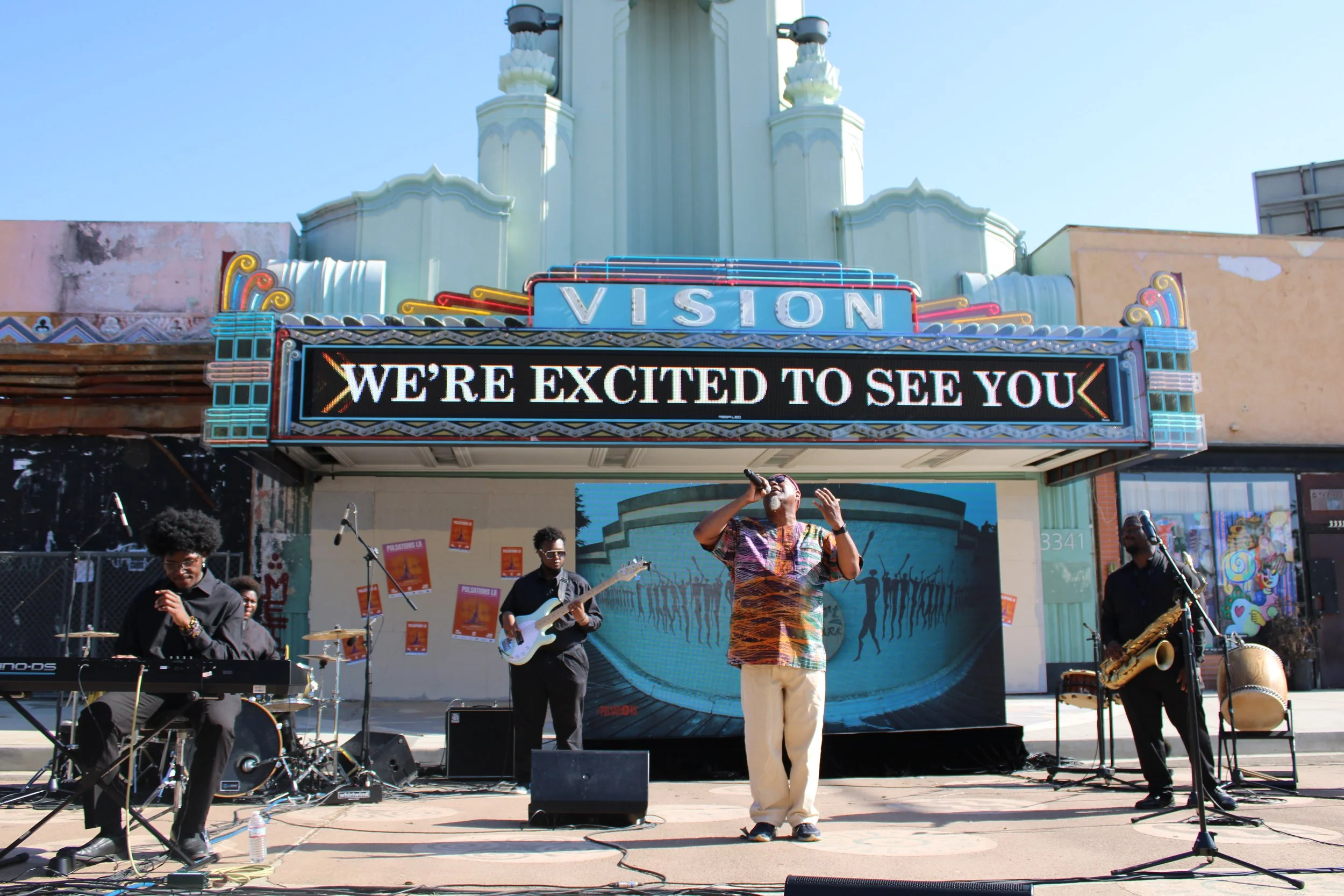 Dwight Trible performing at the Pulsations event in front of the Vision Theater in Leimert Park.