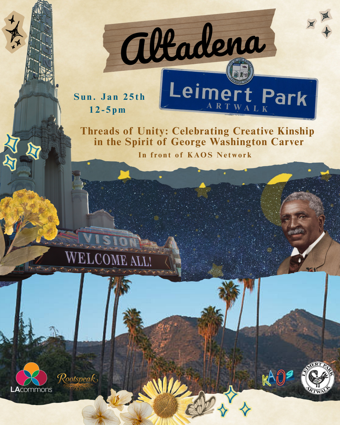 At this month’s upcoming Leimert Park Artwalk, we honor the deep artistic and historical connections between Altadena and Leimert Park as well as creating space for community gathering and Altadena Recovery. The day’s activities are inspired by the innovative and regenerative spirit of George Washington Carver.